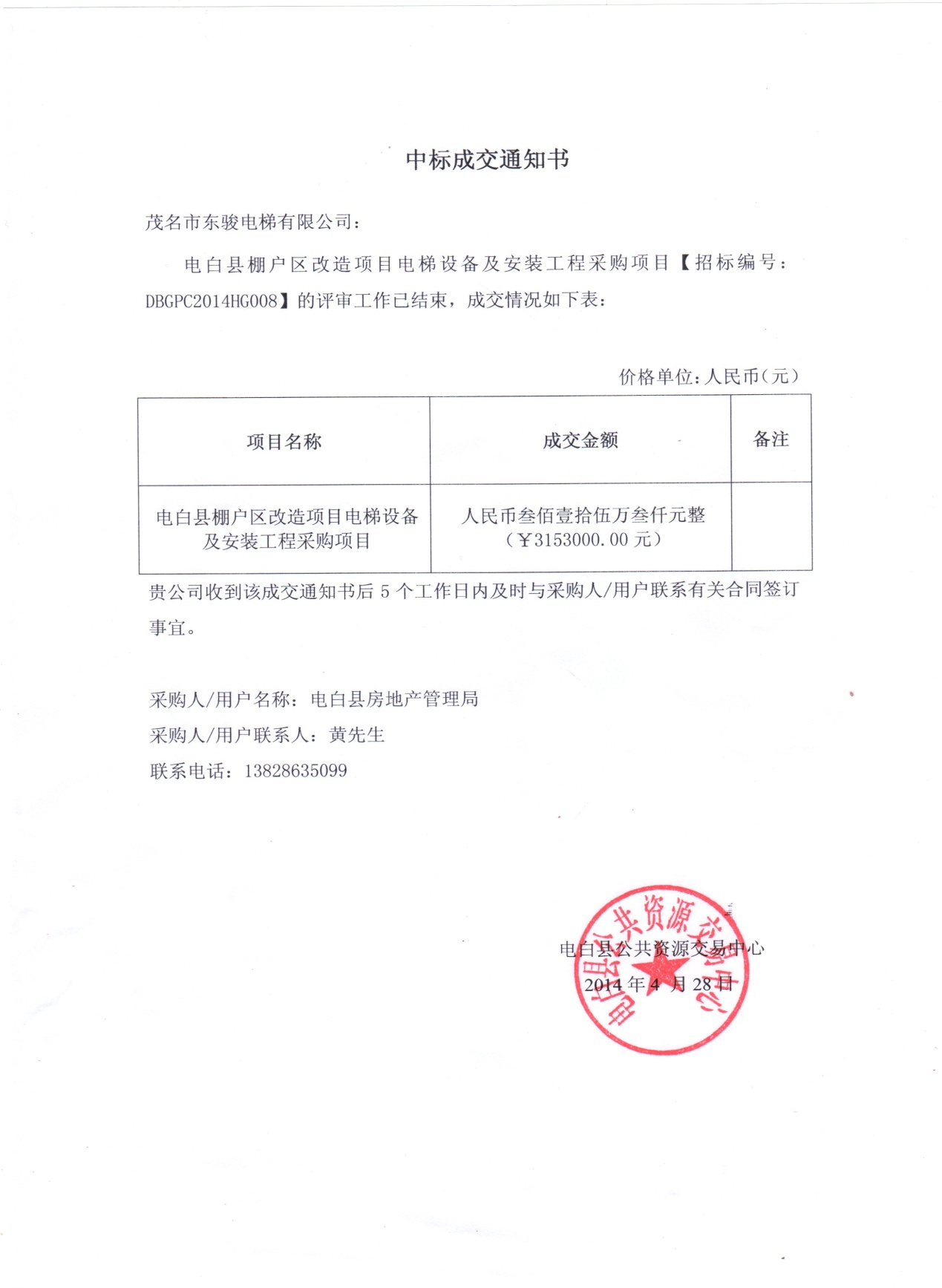 | 祝賀茂名市東駿電梯有限公司中標(biāo)電白縣房地產(chǎn)管理局電梯設(shè)備采購招標(biāo)項目 |